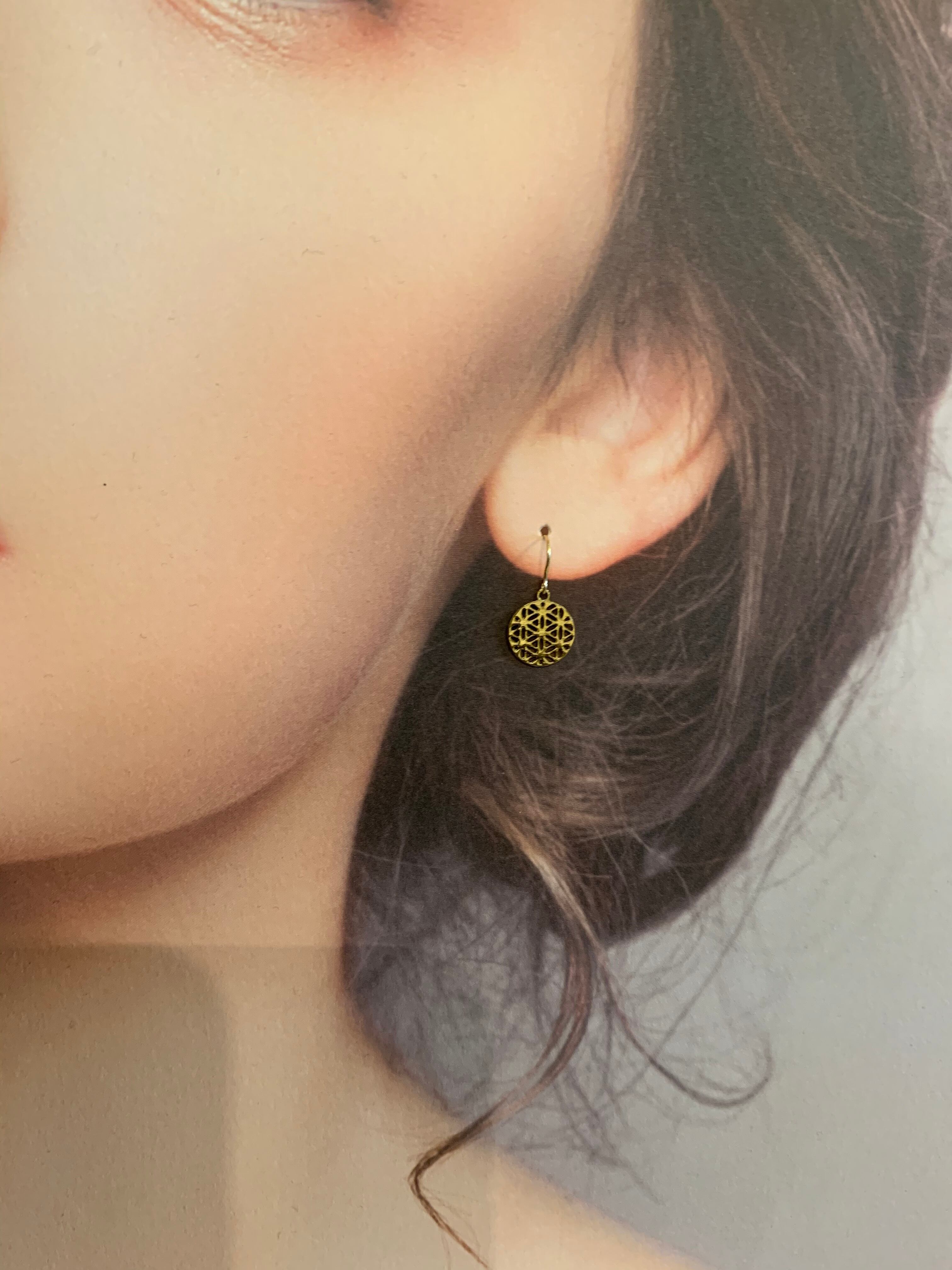 約10ミリの小さめな神聖幾何学フラワーオブライフのチャームピアスです。いつも身につけていられるよう、どんなシーンにも合わせやすい作品になっています。