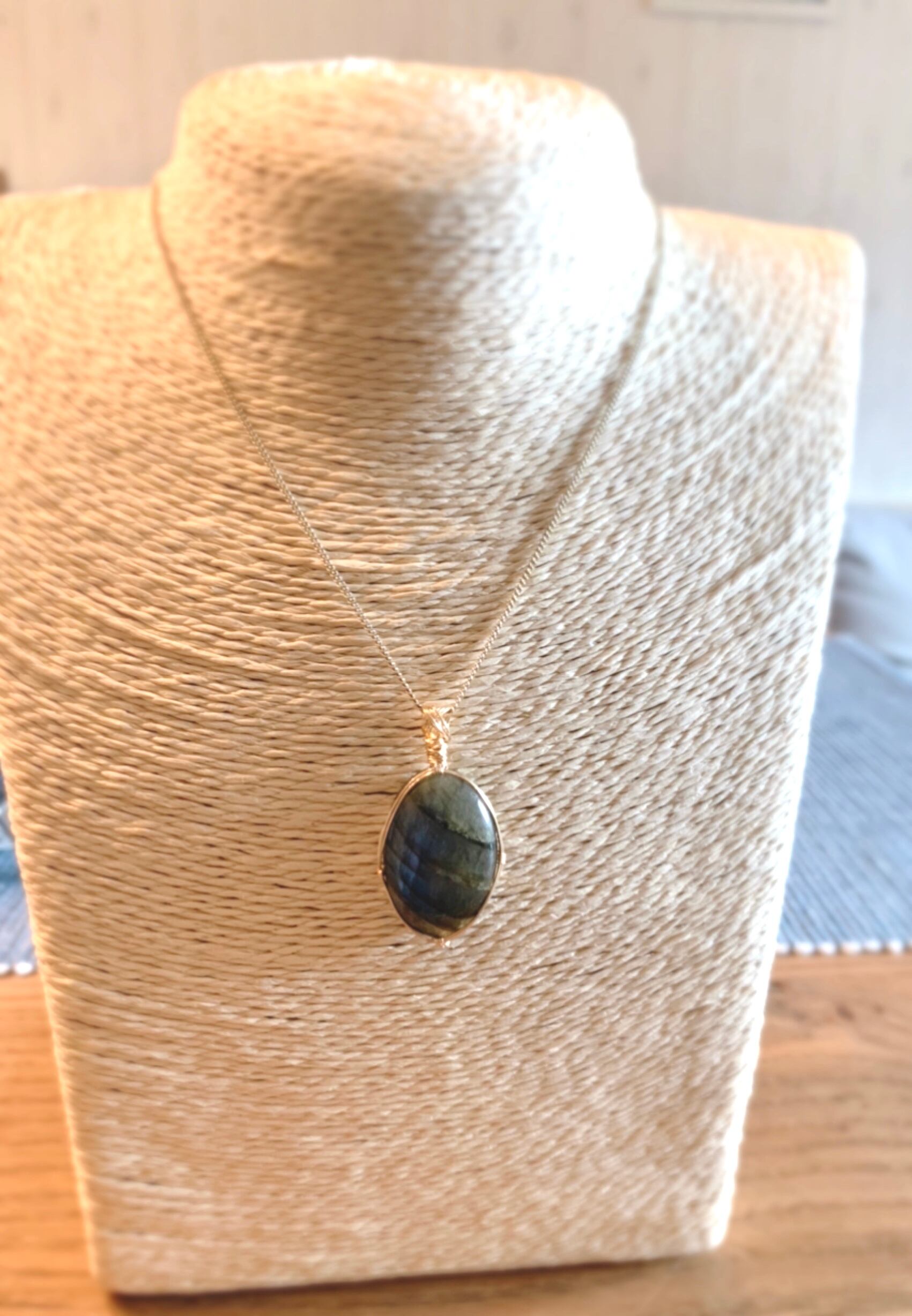 玉虫色の神秘的な光、ラブラドレッセンスいっぱいのラブラドライトのカボションを14kgf のワイヤーで巻いてペンダントトップにしました。